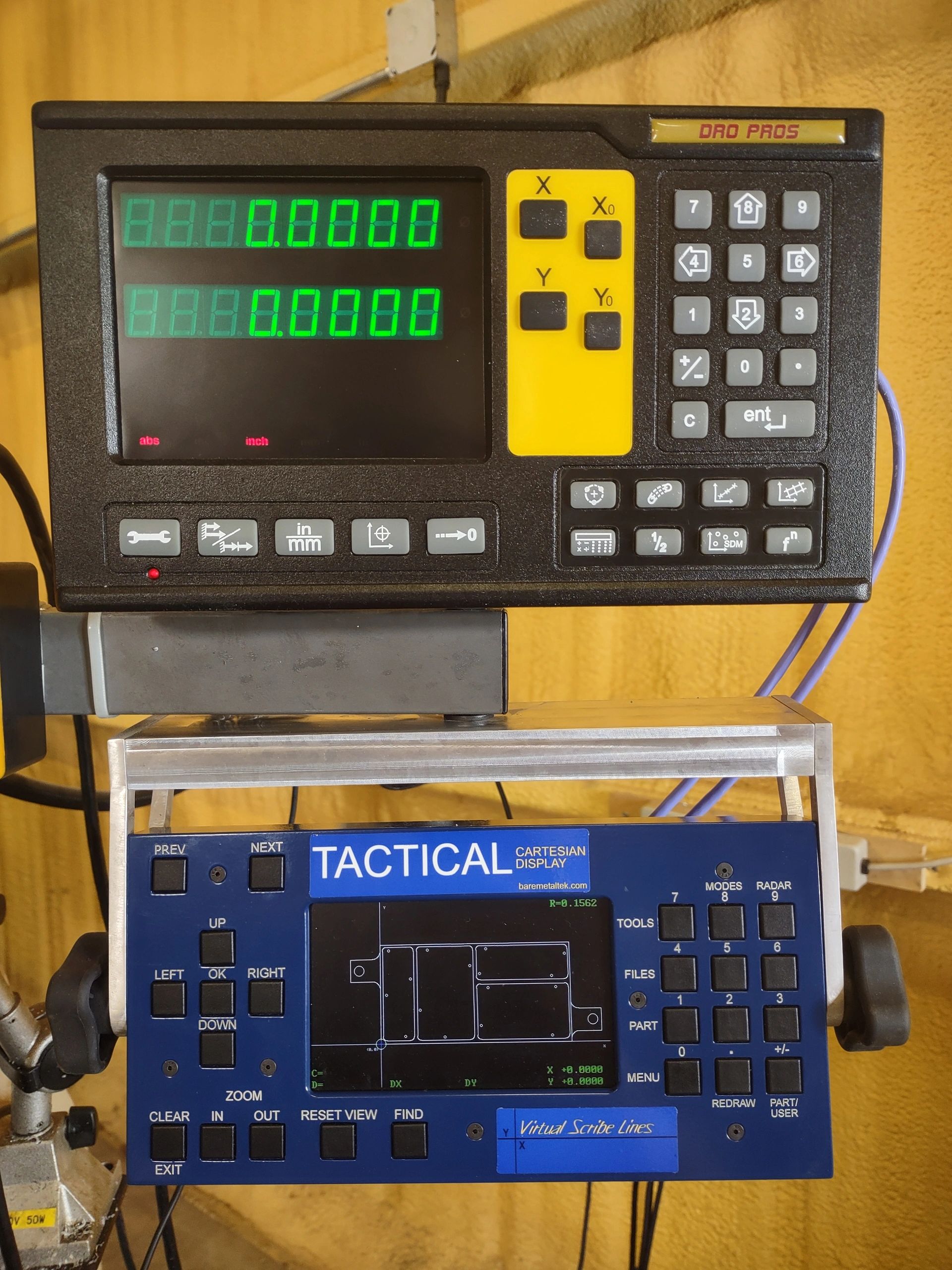 The Cartesian Display is meant to be used with an ordinary DRO as an augmentation to the DRO. The two components are unaware of each other, they simply share the same scale signals. The Cartesian Display can also be used stand-alone; also the machinist may continue using the DRO as usual